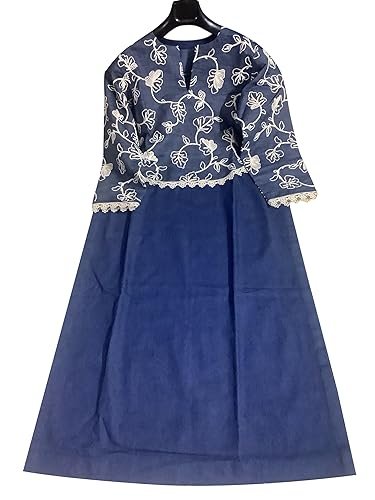 Warm Worth Denim Embroidery Kurti, Blue, Long Length 44 Inch, Floral Pattern, Round Neck, 3/4 Sleeve