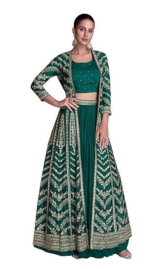 Women’s Green Chinon Stitched Top With Stitched Bottom Full Sleeve Embroidered Choli with Jacket (Lehenga Choli With Jacket) (ME-1196)