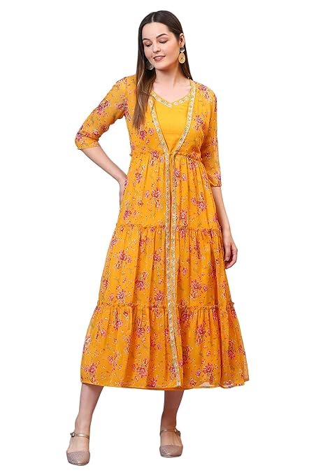 Women’s Yellow Solid Cotton Blend A-line Dress and Floral Printed Gilet